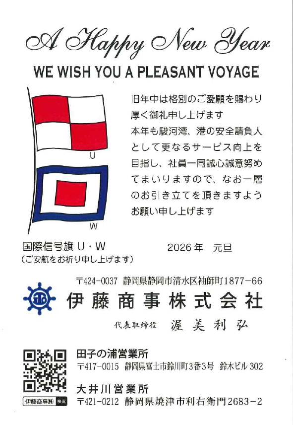 旧年中は格別のご愛願を賜わり厚く御礼申し上げます。本年も駿河湾、港の安全請負人として更なるサービス向上を目指し、社員一同誠心誠意努めてまいりますので、なお一層のお引き立てを頂きますようお願い申し上げます。